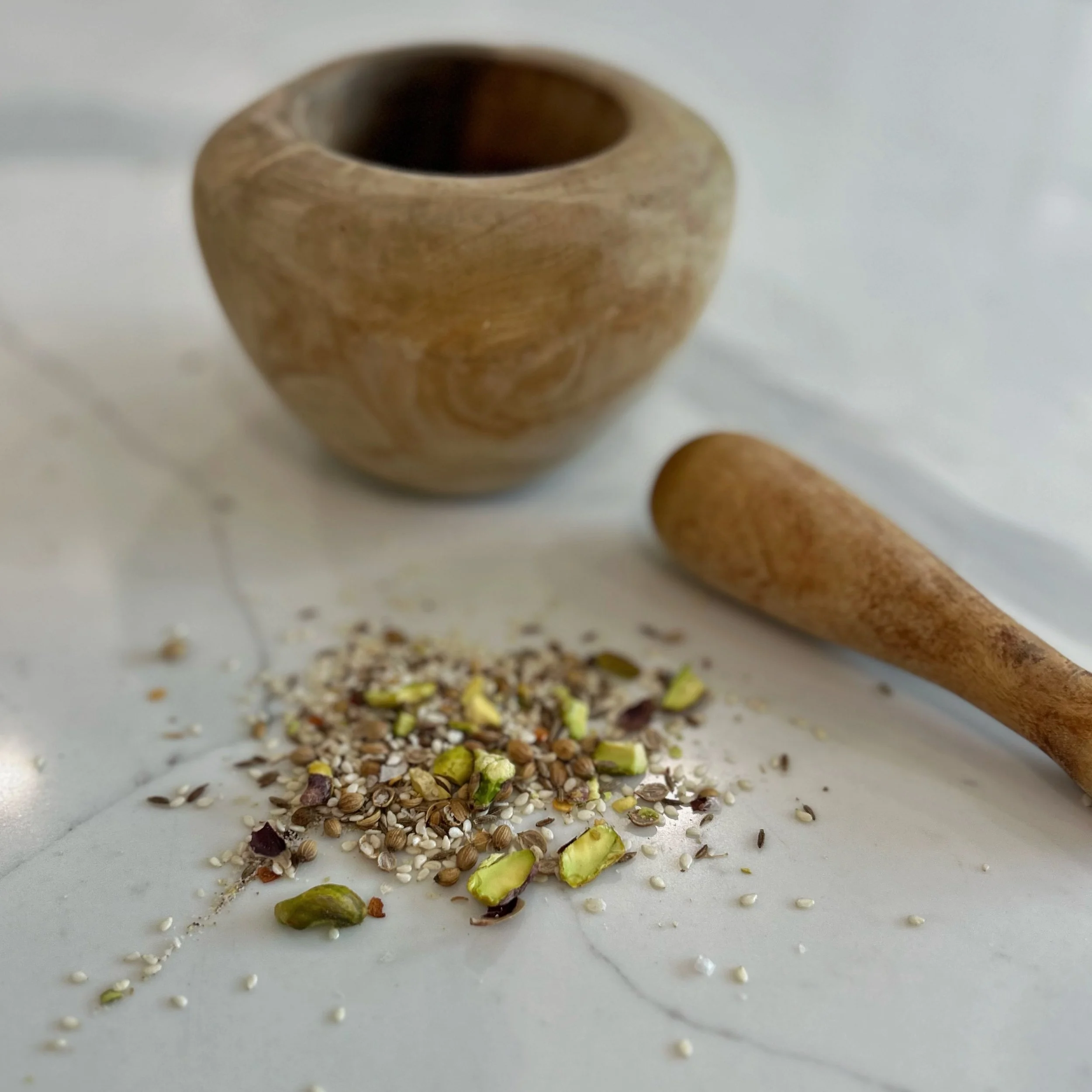 Make the dukkah: Add the pistachios to a dry skillet. Turn heat to medium high and toast just until they take on color. Add the sesame seeds and toast for another 30-60 seconds. Add the coriander seeds, then the cumin seeds (or fennel) and toast just until fragrant, about 15-25 seconds. Finally turn off the heat and add any ground spices, if using, like cardamom and crushed red pepper flakes. Transfer to a sheet of parchment paper or a plate to cool slightly. Then add to a food processor and pulse until lightly crushed up. (Or crush in a mortar and pestle). Stir in the salt and pepper.